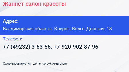 Жаннет, салон красоты по адресу Владимирская область, Ковров, Волго-Донская, 18 в дальнейшем Организация, размещена в следующих категориях: