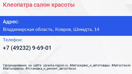 Клеопатра, салон красоты по адресу Владимирская область, Ковров, Шмидта, 14 в дальнейшем Организация, размещена в следующих категориях: