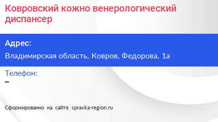 Ковровский кожно-венерологический диспансер по адресу Владимирская область, Ковров, Федорова, 1а в дальнейшем Организация, размещена в следующих категориях: