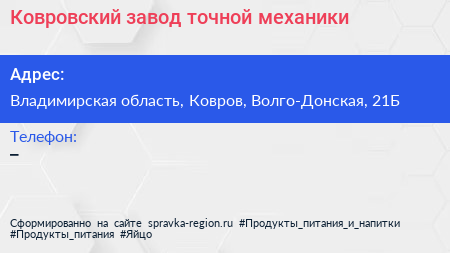 Ковровский завод точной механики по адресу Владимирская область, Ковров, Волго-Донская, 21Б в дальнейшем Организация, размещена в следующих категориях: