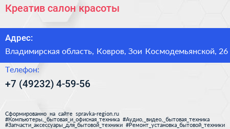 Креатив, салон красоты по адресу Владимирская область, Ковров, Зои Космодемьянской, 26 в дальнейшем Организация, размещена в следующих категориях: