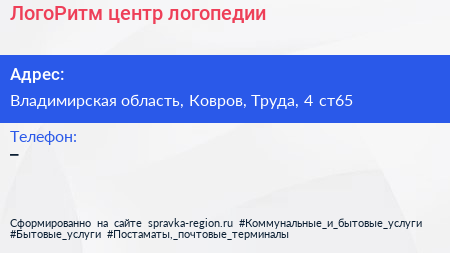 ЛогоРитм, центр логопедии по адресу Владимирская область, Ковров, Труда, 4 ст65 в дальнейшем Организация, размещена в следующих категориях: