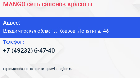 MANGO, сеть салонов красоты по адресу Владимирская область, Ковров, Лопатина, 46 в дальнейшем Организация, размещена в следующих категориях: