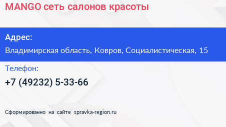 MANGO, сеть салонов красоты по адресу Владимирская область, Ковров, Социалистическая, 15 в дальнейшем Организация, размещена в следующих категориях: