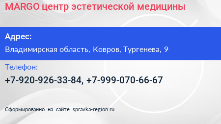 MARGO, центр эстетической медицины по адресу Владимирская область, Ковров, Тургенева, 9 в дальнейшем Организация, размещена в следующих категориях: