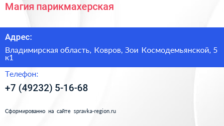 Магия, парикмахерская по адресу Владимирская область, Ковров, Зои Космодемьянской, 5 к1 в дальнейшем Организация, размещена в следующих категориях: