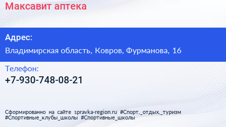 Максавит, аптека по адресу Владимирская область, Ковров, Фурманова, 16 в дальнейшем Организация, размещена в следующих категориях:
