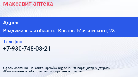 Максавит, аптека по адресу Владимирская область, Ковров, Маяковского, 28 в дальнейшем Организация, размещена в следующих категориях: