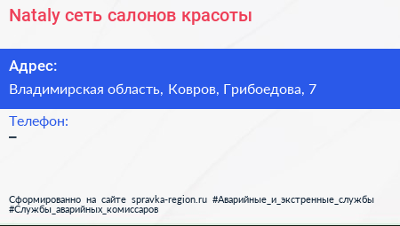 Nataly, сеть салонов красоты по адресу Владимирская область, Ковров, Грибоедова, 7 в дальнейшем Организация, размещена в следующих категориях: