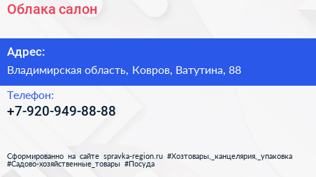 Облака, салон по адресу Владимирская область, Ковров, Ватутина, 88 в дальнейшем Организация, размещена в следующих категориях: