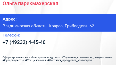 Ольга, парикмахерская по адресу Владимирская область, Ковров, Грибоедова, 62 в дальнейшем Организация, размещена в следующих категориях: