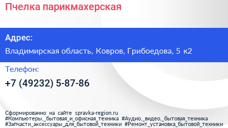 Пчелка, парикмахерская по адресу Владимирская область, Ковров, Грибоедова, 5 к2 в дальнейшем Организация, размещена в следующих категориях: