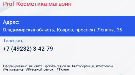 Prof Косметика, магазин по адресу Владимирская область, Ковров, проспект Ленина, 35 в дальнейшем Организация, размещена в следующих категориях: