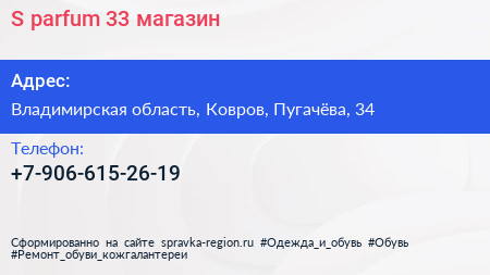 S parfum 33, магазин по адресу Владимирская область, Ковров, Пугачёва, 34 в дальнейшем Организация, размещена в следующих категориях: