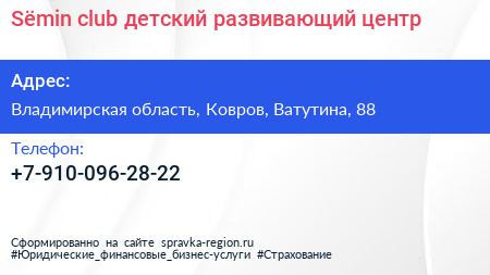 Sёmin club, детский развивающий центр по адресу Владимирская область, Ковров, Ватутина, 88 в дальнейшем Организация, размещена в следующих категориях: