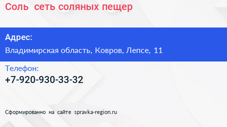 Соль+, сеть соляных пещер по адресу Владимирская область, Ковров, Лепсе, 11 в дальнейшем Организация, размещена в следующих категориях: