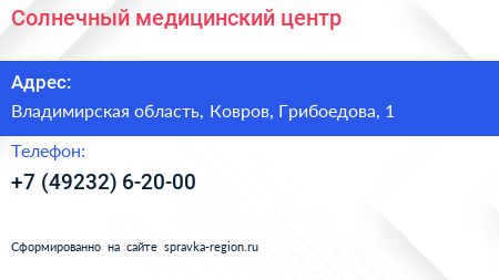 Солнечный, медицинский центр по адресу Владимирская область, Ковров, Грибоедова, 1 в дальнейшем Организация, размещена в следующих категориях:
