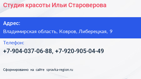 Студия красоты Ильи Староверова по адресу Владимирская область, Ковров, Либерецкая, 9 в дальнейшем Организация, размещена в следующих категориях: