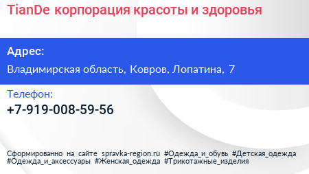 TianDe, корпорация красоты и здоровья по адресу Владимирская область, Ковров, Лопатина, 7 в дальнейшем Организация, размещена в следующих категориях: