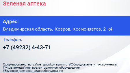 Зеленая аптека по адресу Владимирская область, Ковров, Космонавтов, 2 к4 в дальнейшем Организация, размещена в следующих категориях: