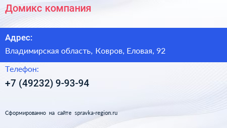 Домикс, компания по адресу Владимирская область, Ковров, Еловая, 92 в дальнейшем Организация, размещена в следующих категориях: