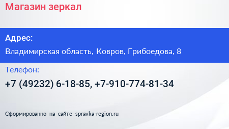 Магазин зеркал по адресу Владимирская область, Ковров, Грибоедова, 8 в дальнейшем Организация, размещена в следующих категориях: