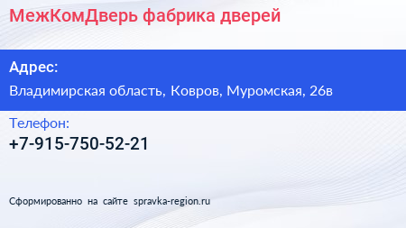 МежКомДверь, фабрика дверей по адресу Владимирская область, Ковров, Муромская, 26в в дальнейшем Организация, размещена в следующих категориях: