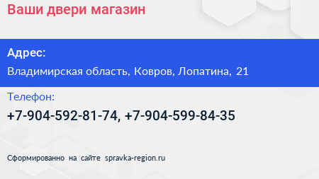 Ваши двери, магазин по адресу Владимирская область, Ковров, Лопатина, 21 в дальнейшем Организация, размещена в следующих категориях: