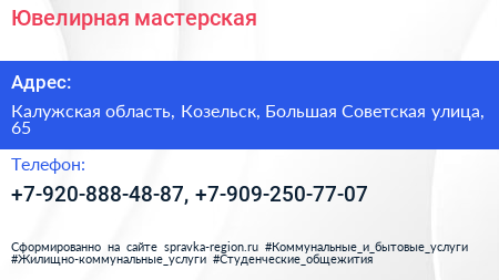 Ювелирная мастерская по адресу Калужская область, Козельск, Большая Советская улица, 65 в дальнейшем Организация, размещена в следующих категориях: