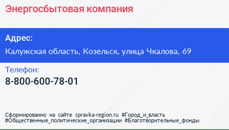 Энергосбытовая компания по адресу Калужская область, Козельск, улица Чкалова, 69 в дальнейшем Организация, размещена в следующих категориях: