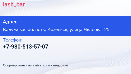 lash_bar по адресу Калужская область, Козельск, улица Чкалова, 25 в дальнейшем Организация, размещена в следующих категориях: