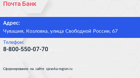 Почта Банк по адресу Чувашия, Козловка, улица Свободной России, 67 в дальнейшем Организация, размещена в следующих категориях: