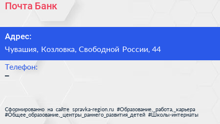 Почта Банк по адресу Чувашия, Козловка, Свободной России, 44 в дальнейшем Организация, размещена в следующих категориях: