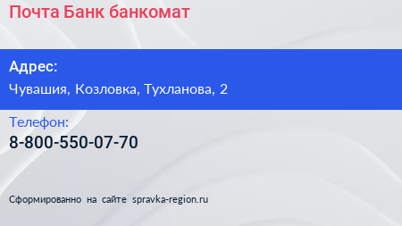 Почта Банк, банкомат по адресу Чувашия, Козловка, Тухланова, 2 в дальнейшем Организация, размещена в следующих категориях: