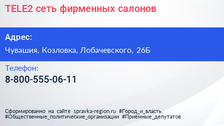 TELE2, сеть фирменных салонов по адресу Чувашия, Козловка, Лобачевского, 26Б в дальнейшем Организация, размещена в следующих категориях: