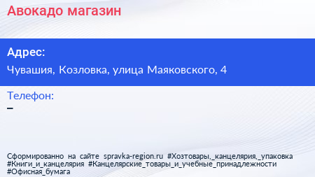 Авокадо, магазин по адресу Чувашия, Козловка, улица Маяковского, 4 в дальнейшем Организация, размещена в следующих категориях: