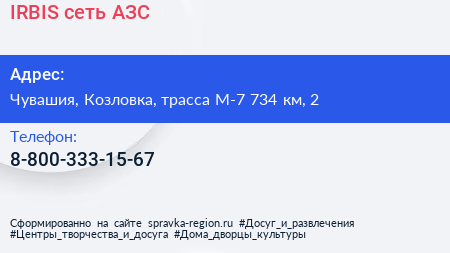 IRBIS, сеть АЗС по адресу Чувашия, Козловка, трасса М-7 734 км, 2 в дальнейшем Организация, размещена в следующих категориях: