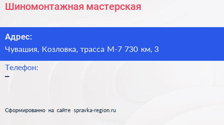 Шиномонтажная мастерская по адресу Чувашия, Козловка, трасса М-7 730 км, 3 в дальнейшем Организация, размещена в следующих категориях: