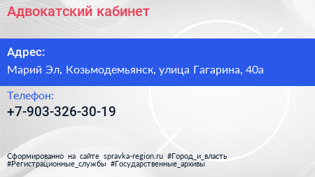 Адвокатский кабинет по адресу Марий Эл, Козьмодемьянск, улица Гагарина, 40а в дальнейшем Организация, размещена в следующих категориях: