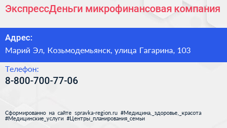 ЭкспрессДеньги, микрофинансовая компания по адресу Марий Эл, Козьмодемьянск, улица Гагарина, 103 в дальнейшем Организация, размещена в следующих категориях: