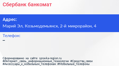 Сбербанк, банкомат по адресу Марий Эл, Козьмодемьянск, 2-й микрорайон, 4 в дальнейшем Организация, размещена в следующих категориях: