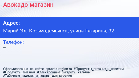 Авокадо, магазин по адресу Марий Эл, Козьмодемьянск, улица Гагарина, 32 в дальнейшем Организация, размещена в следующих категориях: