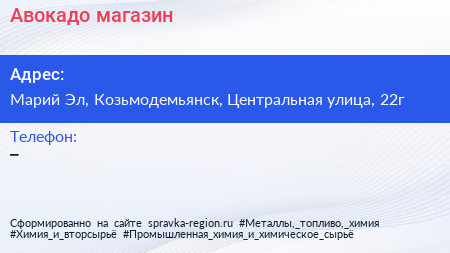 Авокадо, магазин по адресу Марий Эл, Козьмодемьянск, Центральная улица, 22г в дальнейшем Организация, размещена в следующих категориях:
