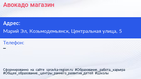 Авокадо, магазин по адресу Марий Эл, Козьмодемьянск, Центральная улица, 5 в дальнейшем Организация, размещена в следующих категориях: