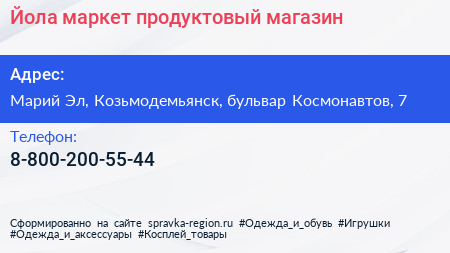 Йола-маркет, продуктовый магазин по адресу Марий Эл, Козьмодемьянск, бульвар Космонавтов, 7 в дальнейшем Организация, размещена в следующих категориях: