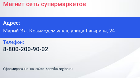 Магнит, сеть супермаркетов по адресу Марий Эл, Козьмодемьянск, улица Гагарина, 24 в дальнейшем Организация, размещена в следующих категориях: