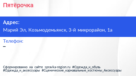 Пятёрочка по адресу Марий Эл, Козьмодемьянск, 3-й микрорайон, 1а в дальнейшем Организация, размещена в следующих категориях: