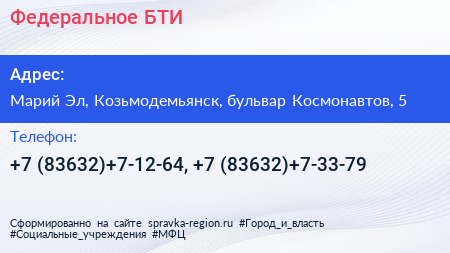 Федеральное БТИ по адресу Марий Эл, Козьмодемьянск, бульвар Космонавтов, 5 в дальнейшем Организация, размещена в следующих категориях: