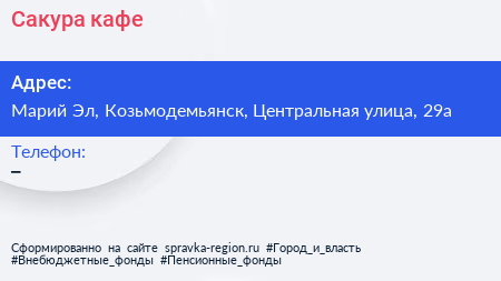 Сакура, кафе по адресу Марий Эл, Козьмодемьянск, Центральная улица, 29а в дальнейшем Организация, размещена в следующих категориях:
