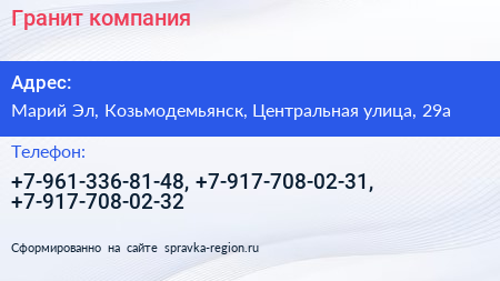 Гранит, компания по адресу Марий Эл, Козьмодемьянск, Центральная улица, 29а в дальнейшем Организация, размещена в следующих категориях: